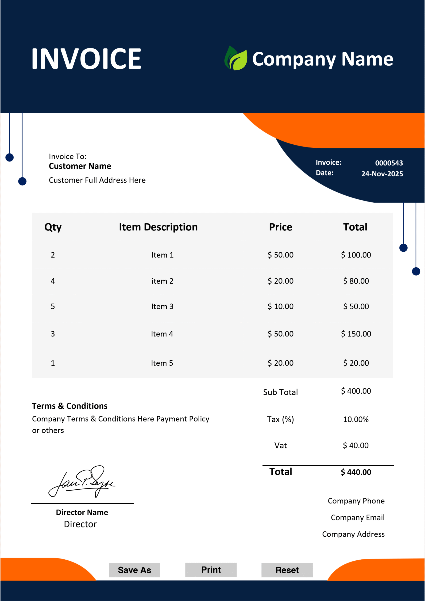 You can preview the design in the demo image provided to see exactly how your invoices will look. Additionally, a video tutorial is included to guide you through editing the template, entering your information, and making full use of the automatic calculation features. This ensures that even beginners can handle it easily.