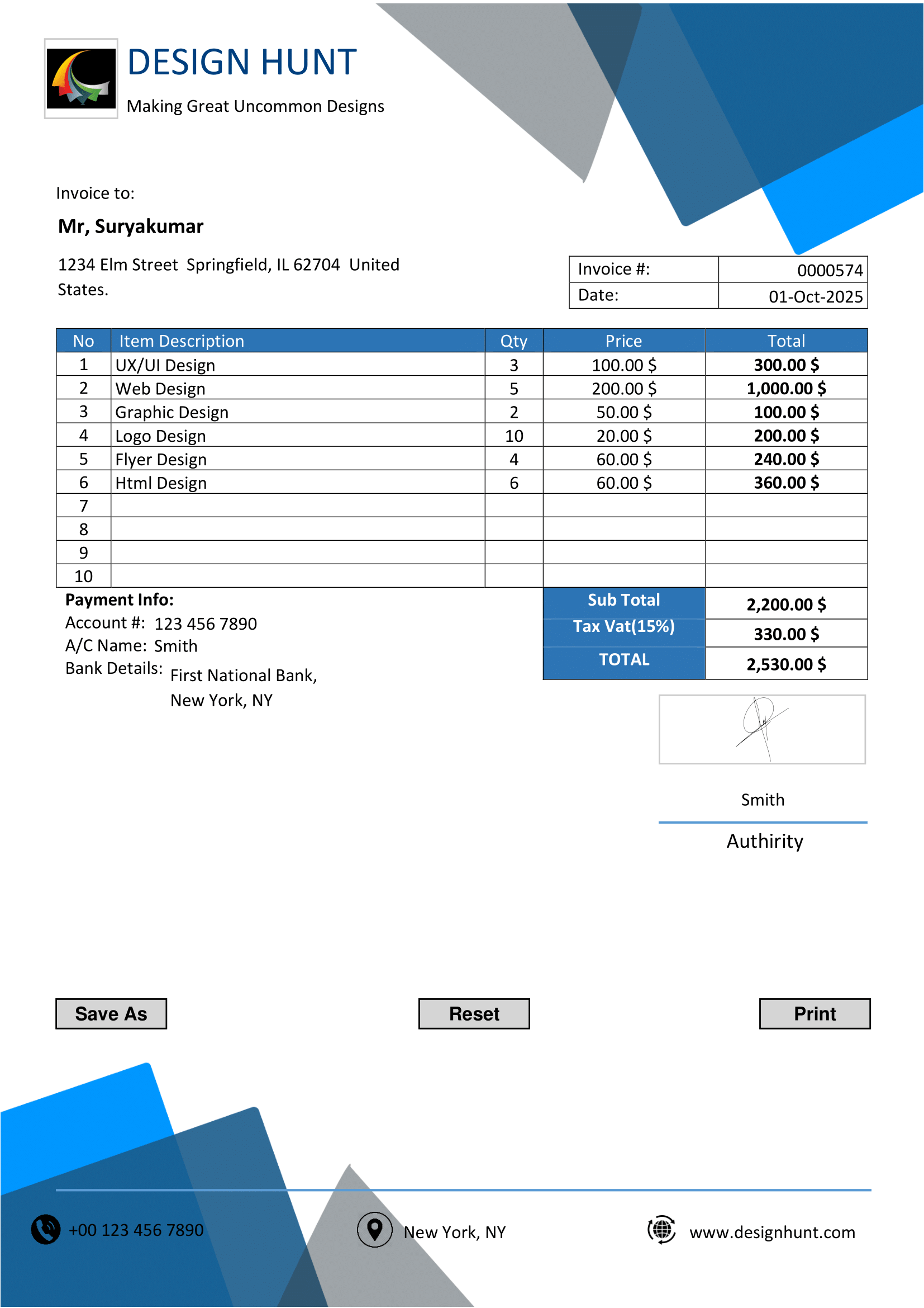 - ✅ Three Buttons included 1. Save as 2. Reset 3. PrintN.B- Add a decimal (.) while input the tax(%) field
