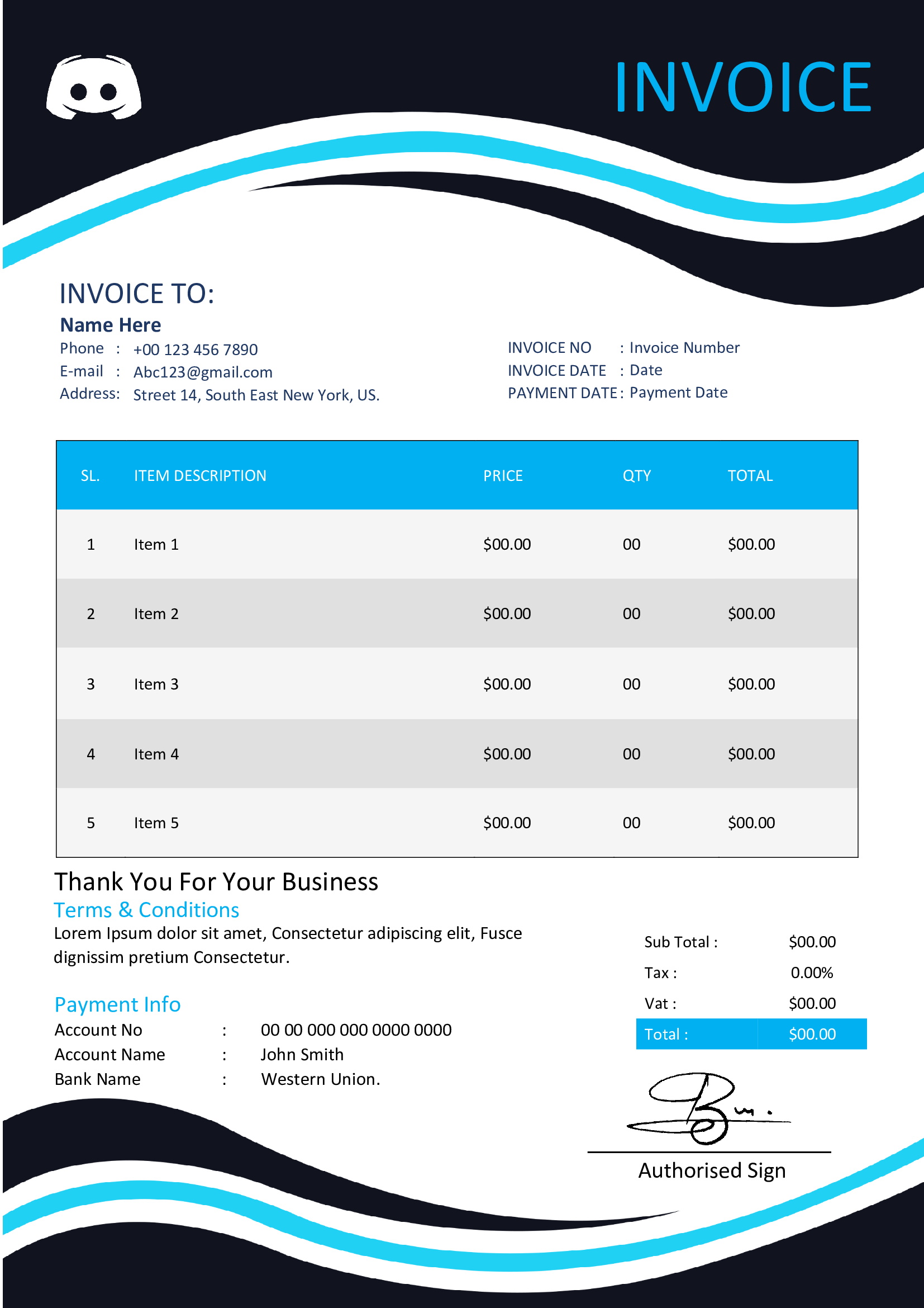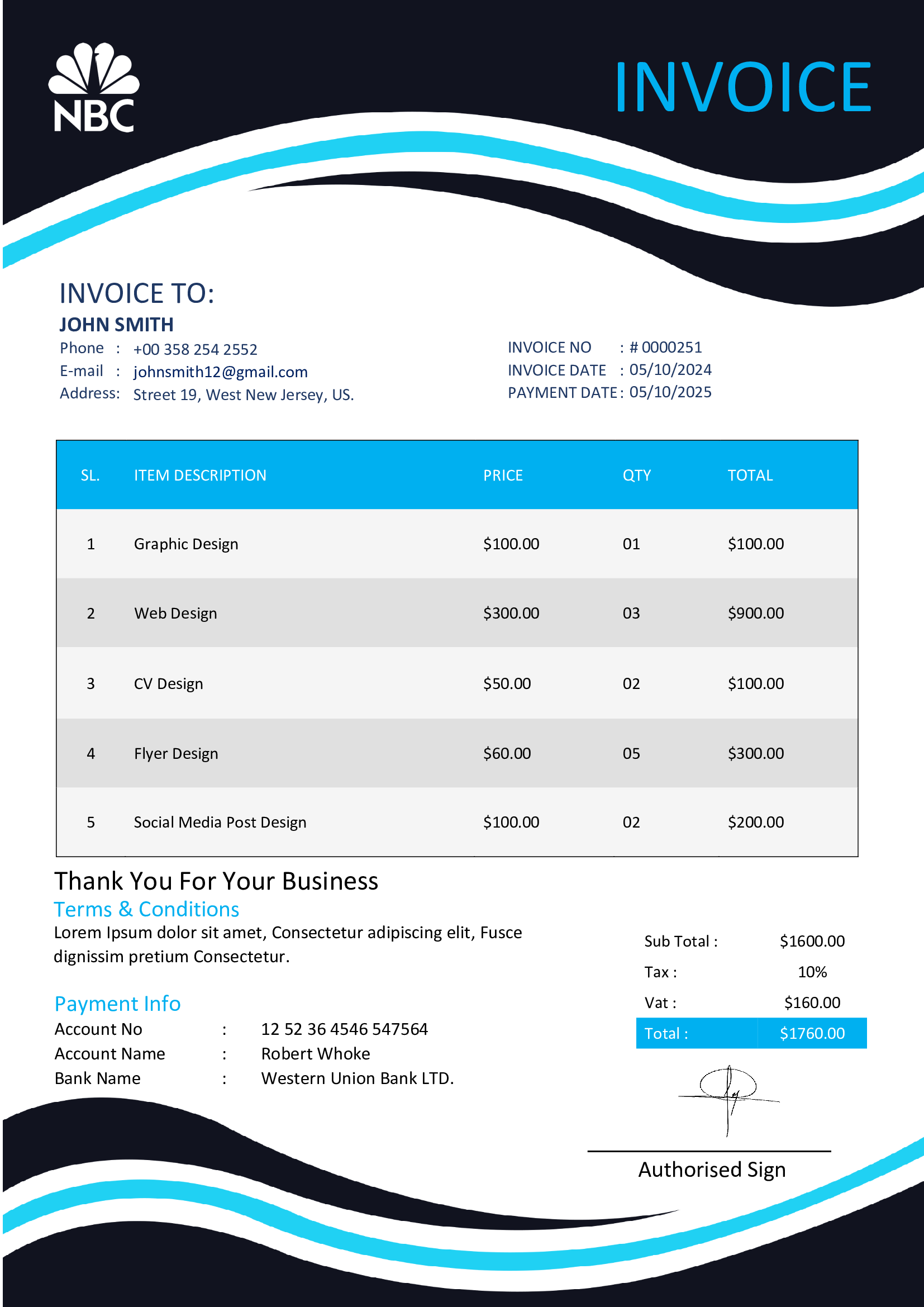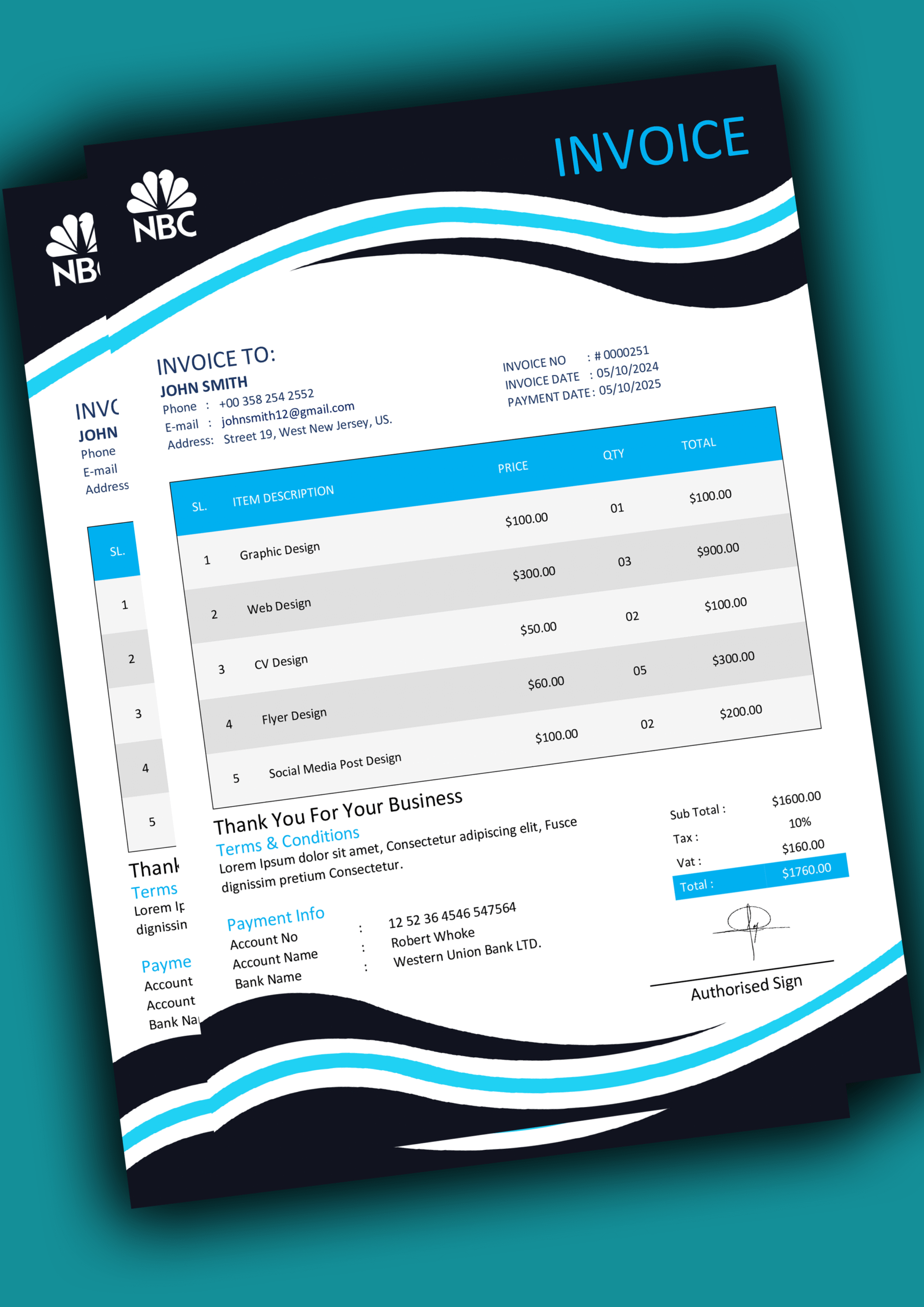 - ✅ Fully editable — Company Logo, Client Details, Invoice Number, Dates, Item Descriptions, Quantities, Rates, and Totals