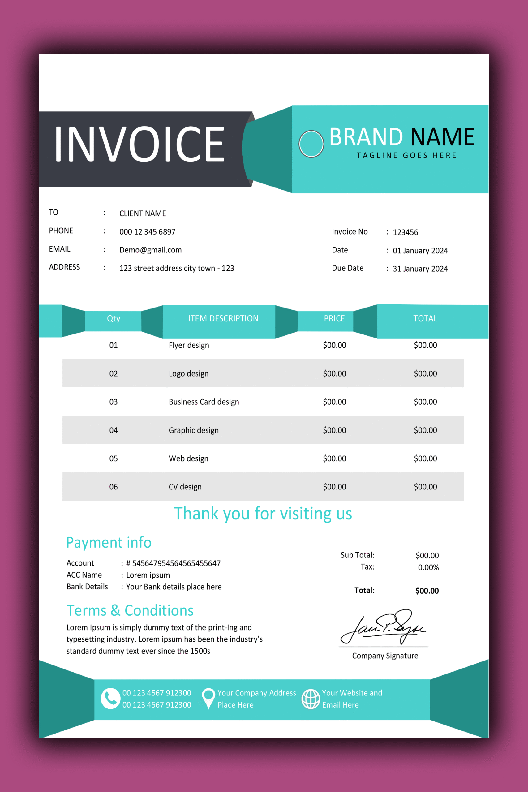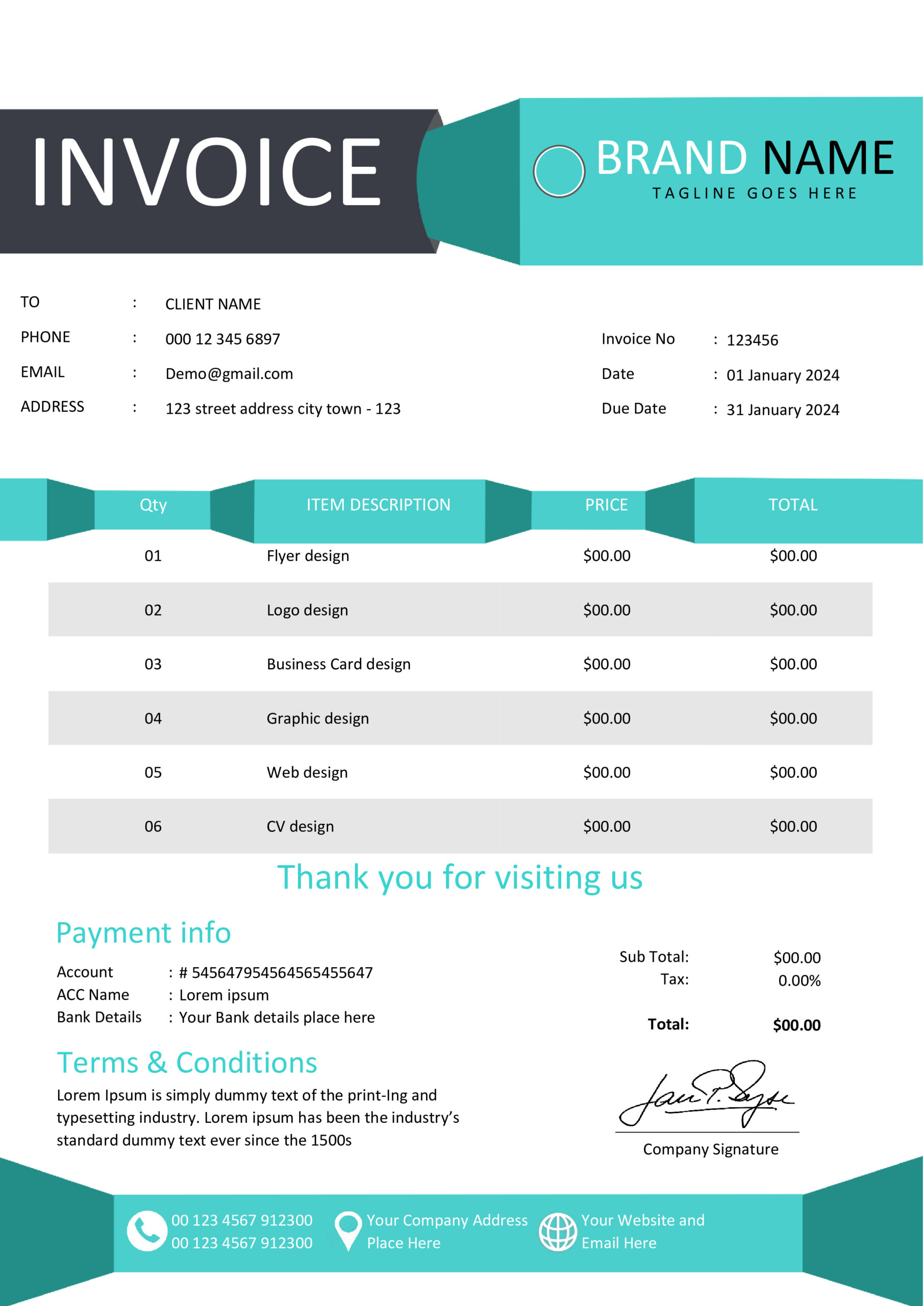 - ✅ Fully editable — Company Logo, Client Details, Invoice Number, Dates, Item Descriptions, Quantities, Rates, and Totals