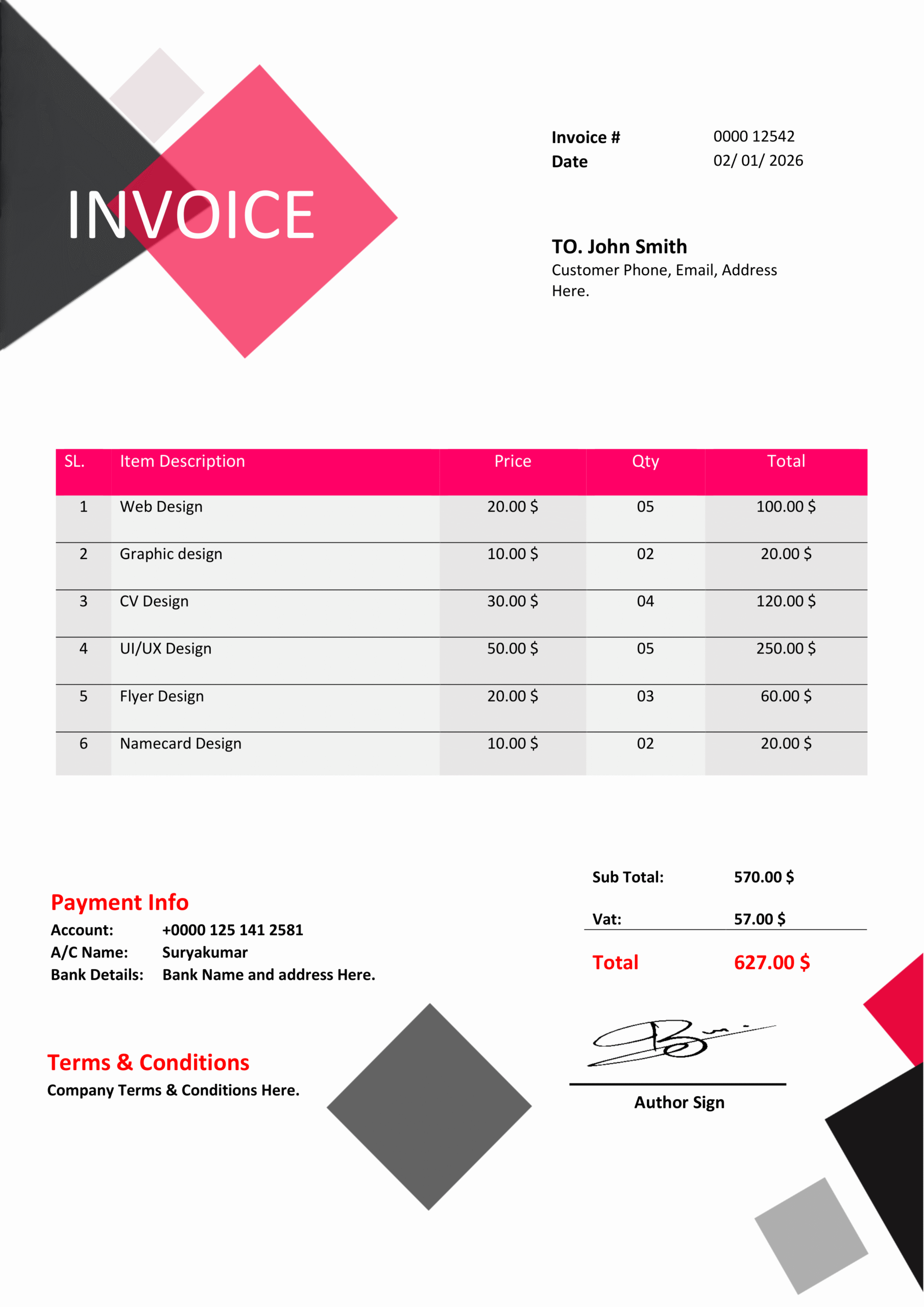 - ✅ Fully editable — Company Logo, Client Details, Invoice Number, Dates, Item Descriptions, Quantities, Rates, and Totals